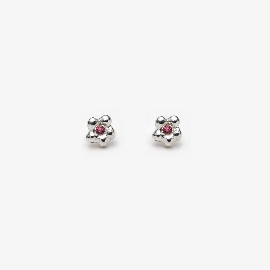 Boucle d'oreille en forme de petite fleur en argent sterling avec un saphir coloré.