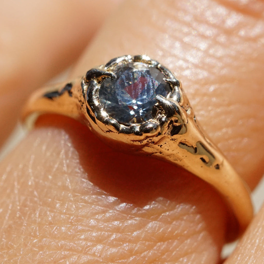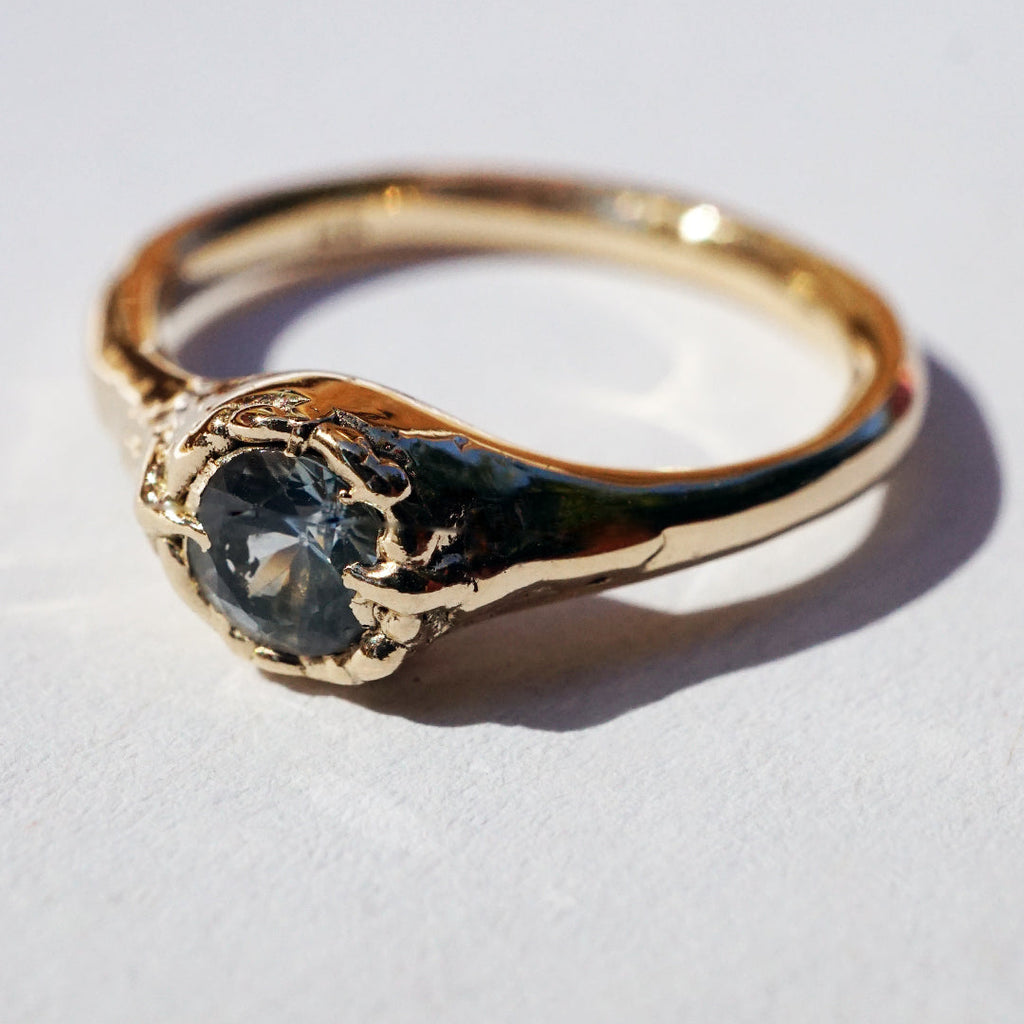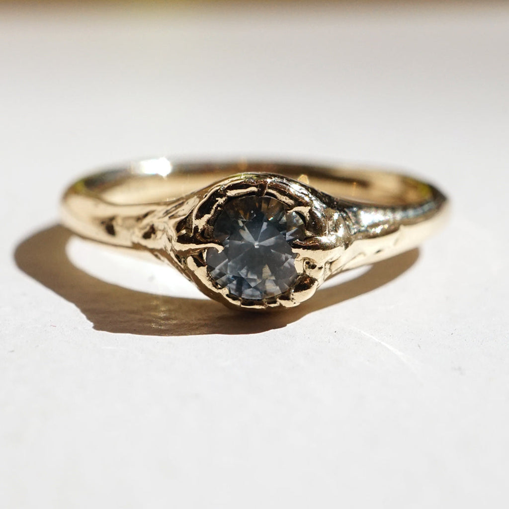 Ce saphir éthique du Montana de couleur bleu-gris est directement coulé dans le métal; j’ai construit la bague en cire, placé le saphir, puis l’ai fait coulé en or jaune 14 carats