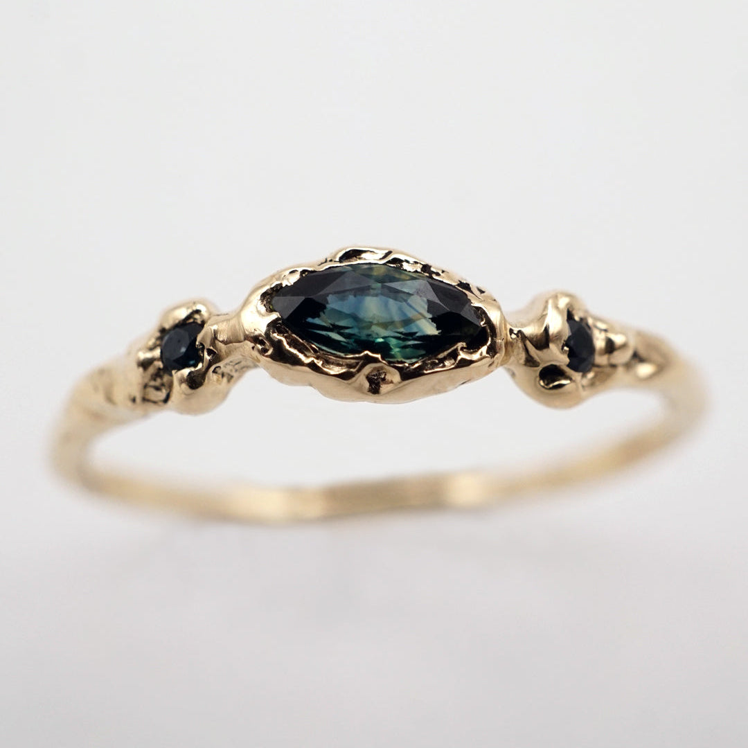 Bague ARIANE II - saphir marquise bleu-vert et or 10k - pièce unique