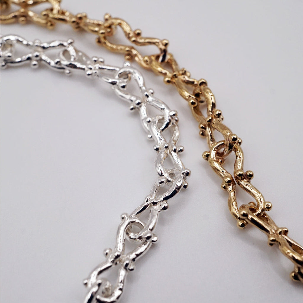 Cette chaîne est fabriquée à partir de maillons de forme infinie, entièrement faits à la main et assemblés un à un. Elle est souple et parfaite pour faire un ''statement'' ou pour créer de la texture à agencer avec d'autres chaînes.
