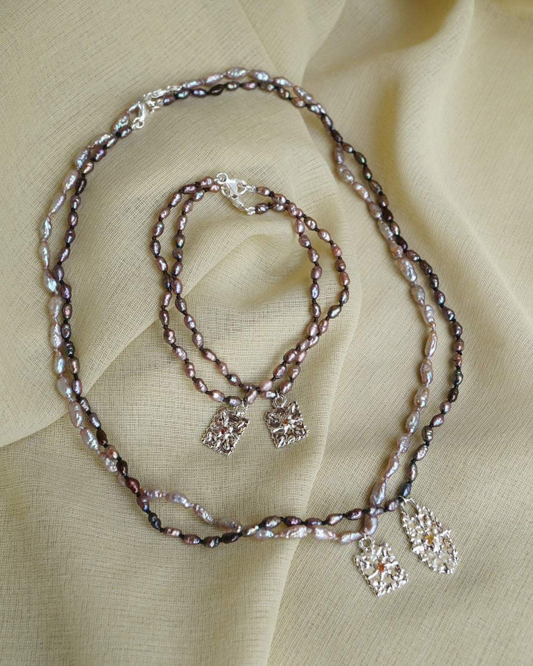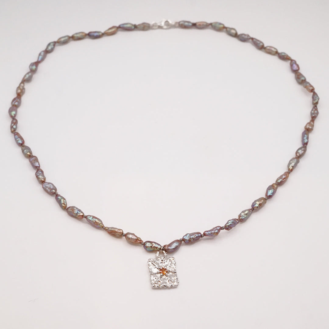 - les perles Keshi naturelles vintage grises irradiées avec la breloque carrée et saphir abricot.