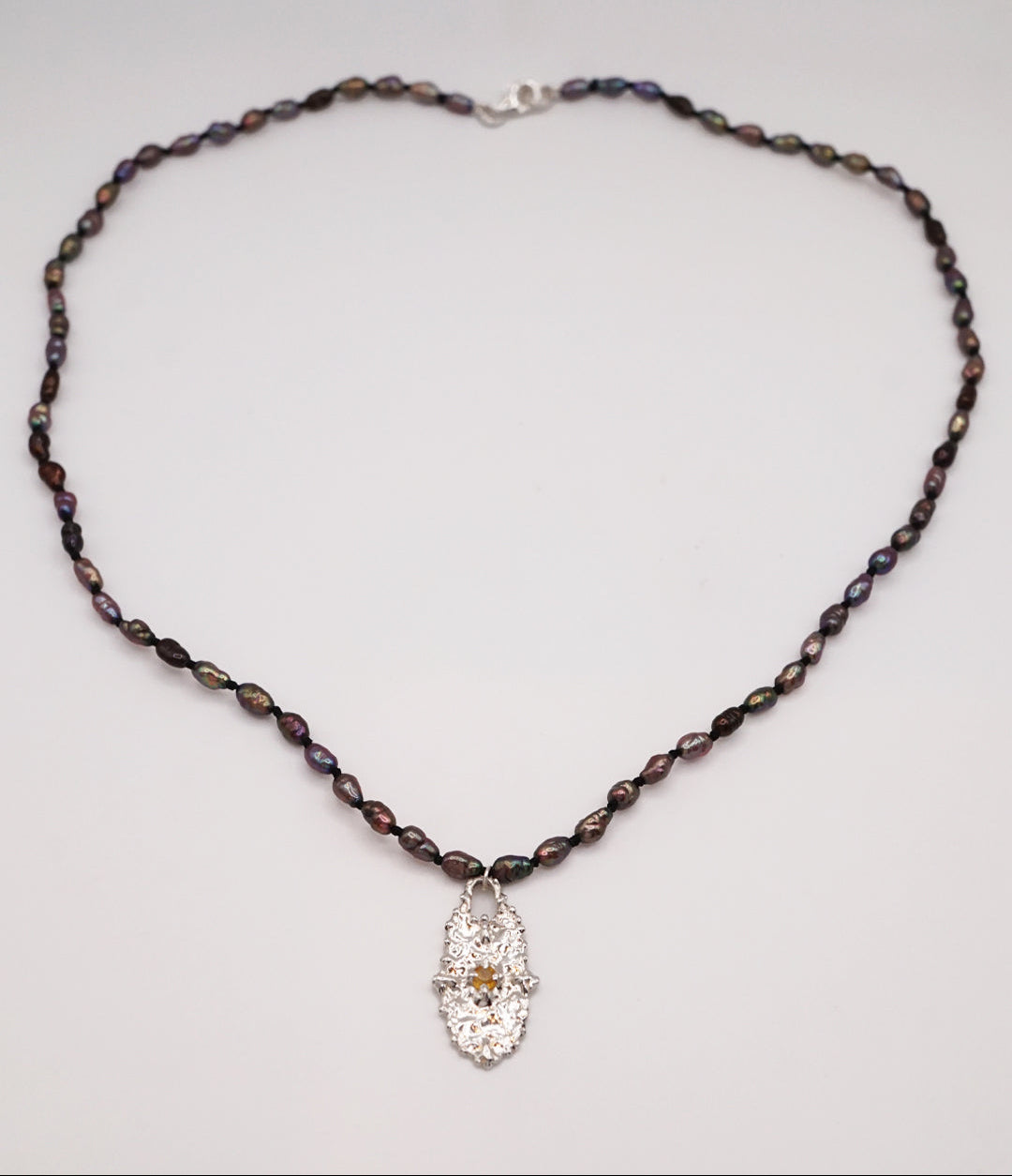 Collier de perles keshi vintage, naturelles et irradiées, avec pendentif TALISMAN incrusté d'un saphir naturel et argent sterling.