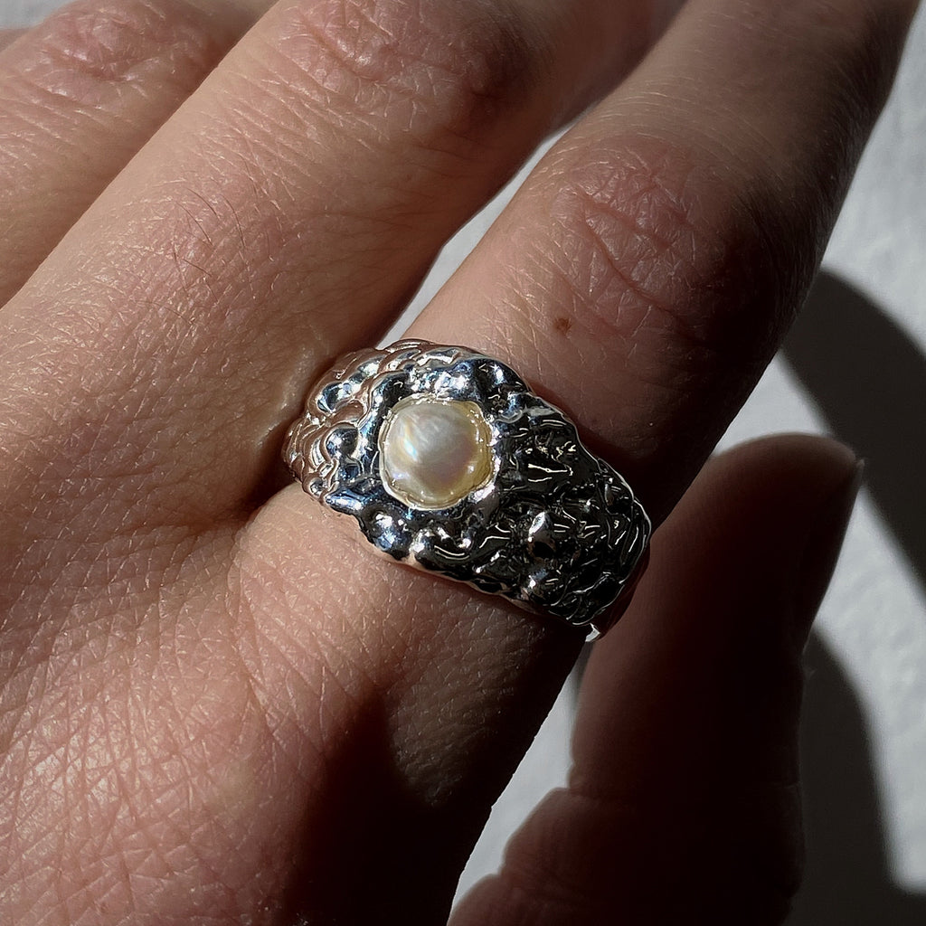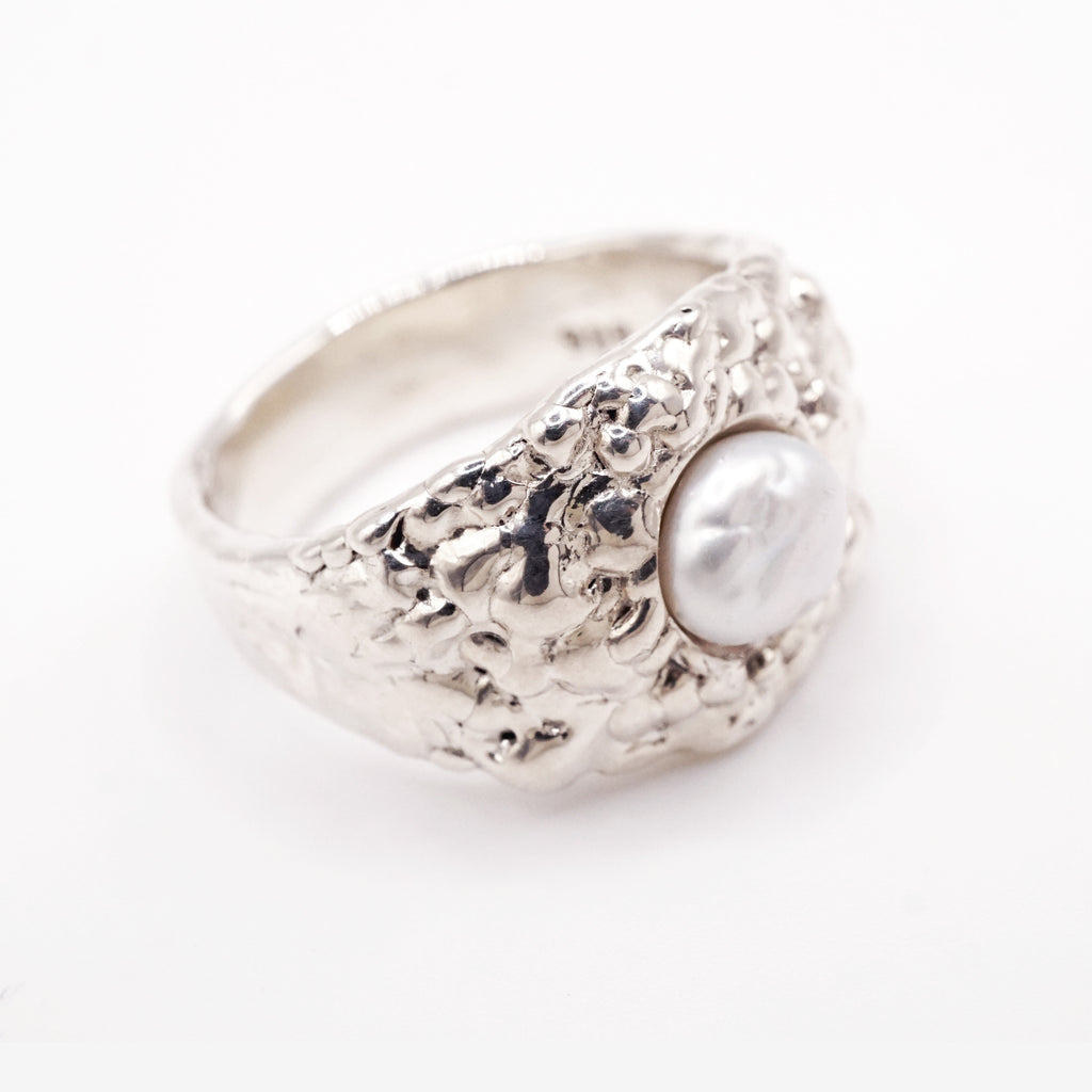 Confectionnée à la main, cette bague est d'abord sculptée en cire, ensuite coulée en argent sterling 925. Cette pièce originale est incrustée d'une perle naturelle baroque Keshi.
